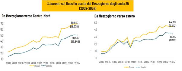 Dal 2002 al 2024 un milione circa di giovani meridionali (persone con meno di 35 anni), di cui 350 mila in possesso di laurea, si è trasferito nel Centro Nord. Al netto dei rientri dal Centro Nord la perdita di giovani nel Mezzogiorno è stata superiore a 500mila unità, di cui 270 mila laureati.