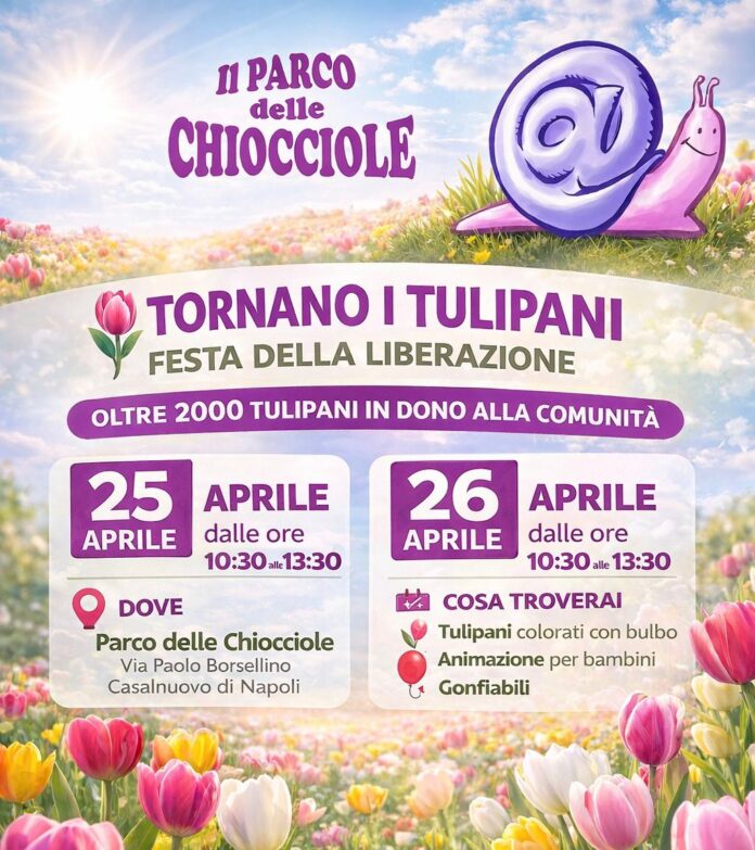 Il Parco delle Chiocciole si prepara a diventare il cuore pulsante delle celebrazioni per la Festa della Liberazione a Casalnuovo di Napoli. Sabato 25 e domenica 26 aprile, dalle 10:30 alle 13:30, il parco di via Paolo Borsellino ospiterà un’iniziativa simbolica e coinvolgente: la distribuzione di oltre duemila tulipani, confezionati con i loro bulbi, come segno di rinascita e partecipazione. Un gesto che unisce la comunità in un momento di riflessione e festa, reso possibile grazie alla collaborazione tra l’associazione Una Città Che… e l’azienda Tulipani Freschi Italiani.