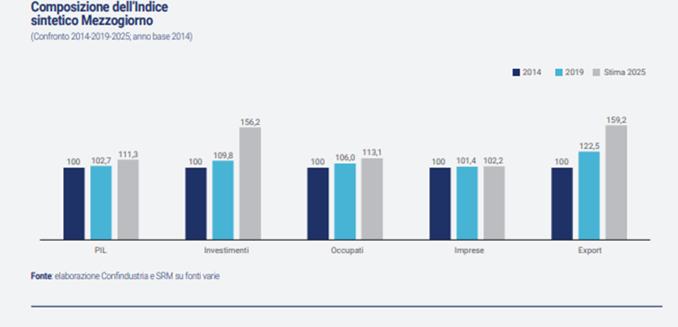 - nel 2025 l’indice sintetico (che include PIL, investimenti, occupati, imprese ed export) del Mezzogiorno si attesta a quota 641,9, intermedia tra Centro (666,5) e Nord (630), ed in crescita del 6,1% sul 2024;