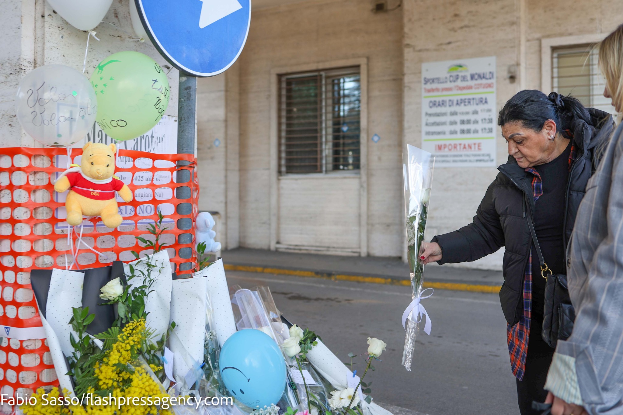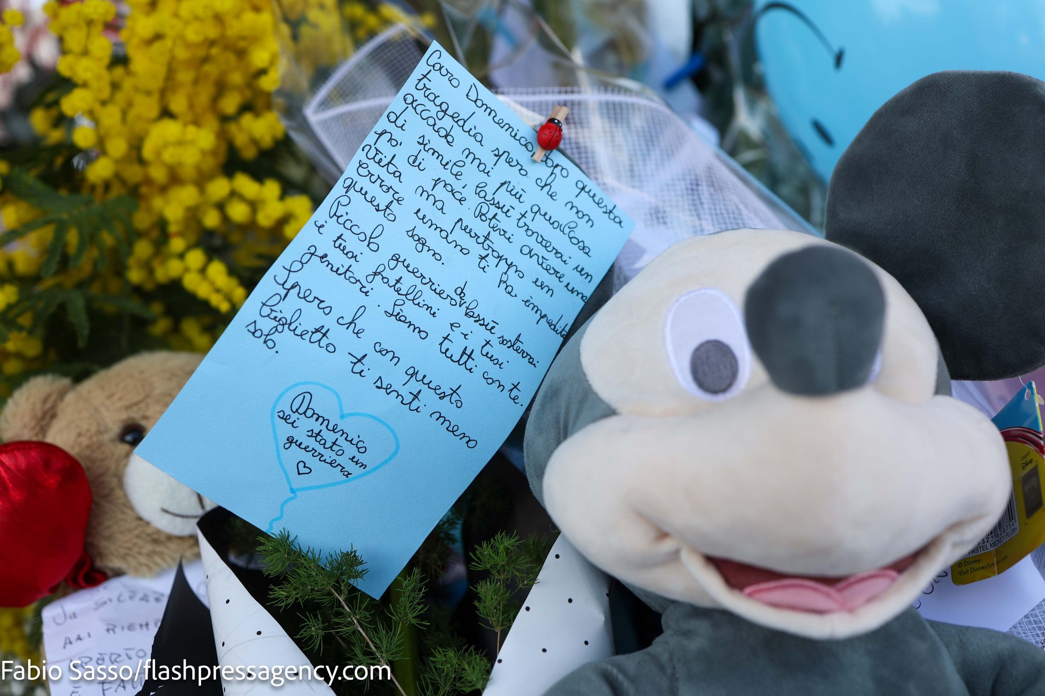 Un silenzio irreale, rotto soltanto dal fruscio dei mazzi di fiori e dai passi leggeri di chi si avvicina in punta di piedi. Questo pomeriggio, davanti all’ospedale Monaldi di Napoli, è un continuo via vai di genitori con i propri figli per mano. Portano fiori bianchi, peluche, bigliettini scritti con grafie incerte e parole semplici ma cariche d’amore: “Ciao piccolo angelo”, “Non ti dimenticheremo”, “Vola in alto Domenico”.