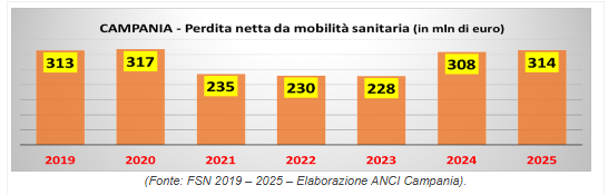 Dal 2019 al 2025, secondo la rielaborazione dell’Anci Campania (cfr. grafico sottostante estratto dall’articolo dell’ANCI citato), la perdita netta di risorse finanziarie da mobilità sanitaria per la Campania è stata pari a 1.945 milioni di euro.