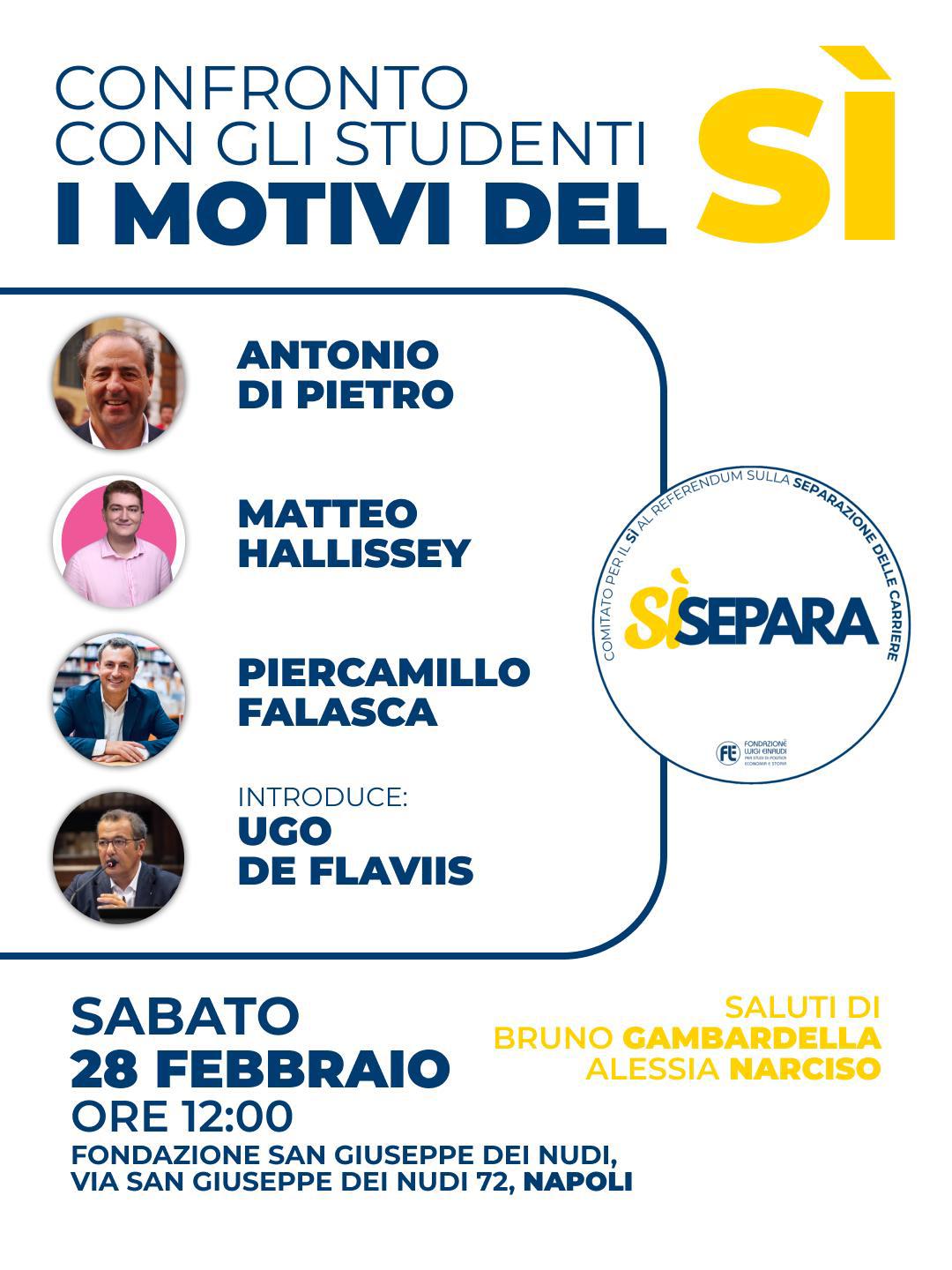 NAPOLI – Un confronto pubblico con gli studenti per approfondire le ragioni del “Sì” al referendum sulla separazione delle carriere in magistratura. L’appuntamento è in programma sabato 28 febbraio alle ore 12:00 presso la Fondazione San Giuseppe dei Nudi, in via San Giuseppe dei Nudi 72.